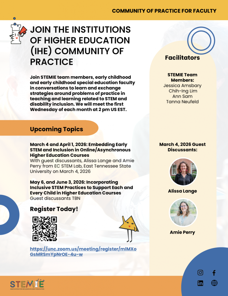 Join STEMIE team members and early childhood and early childhood special education faculty in conversations to learn and exchange strategies around problems of practice in teaching and learning related to STEM and disability inclusion. We will meet the first Wednesday of each month from 2:00 – 3:00 pm U.S. EST.
