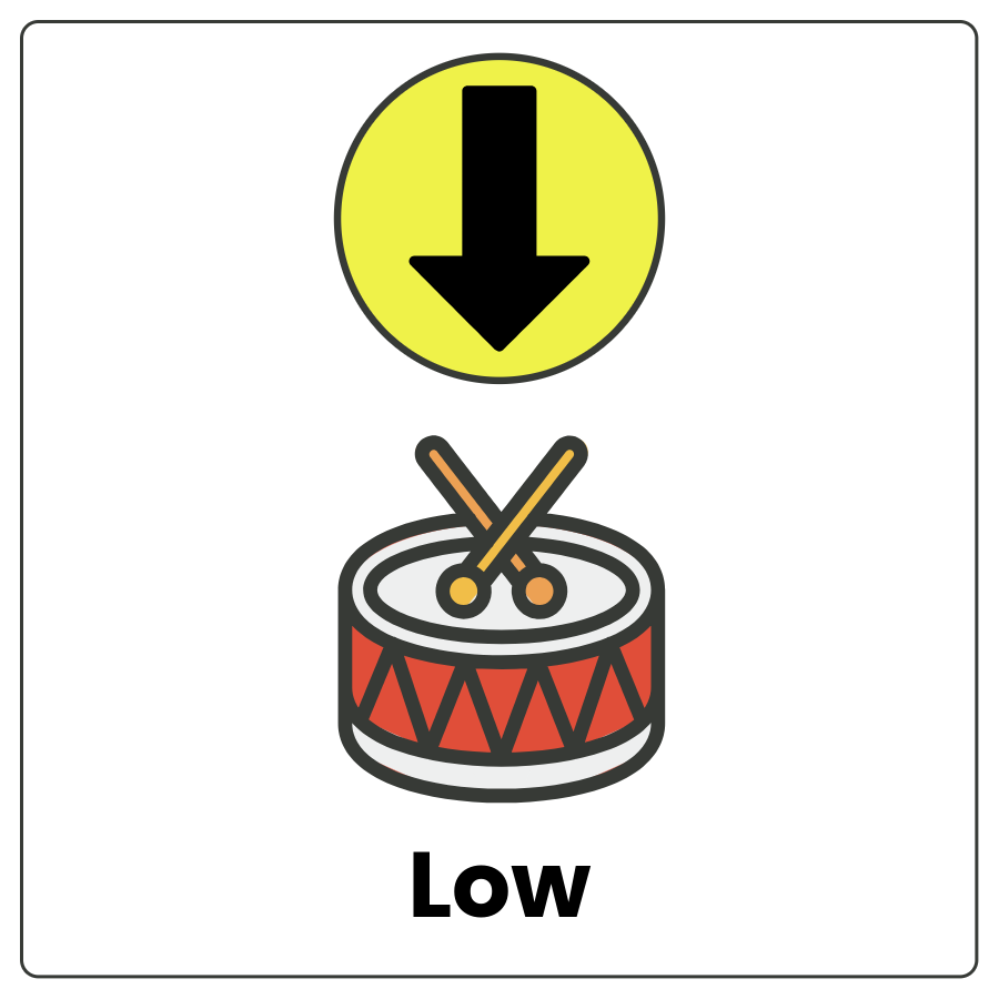 A sound that is deep or rumbly, like a drum, a big dog barking, or a lion roaring. These sounds are made by slower, bigger vibrations.