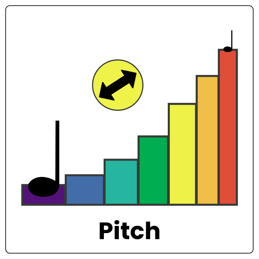 How high or low a sound is. Pitch changes when the speed of the vibrations changes—fast vibrations make high pitch, slow vibrations make low pitch.