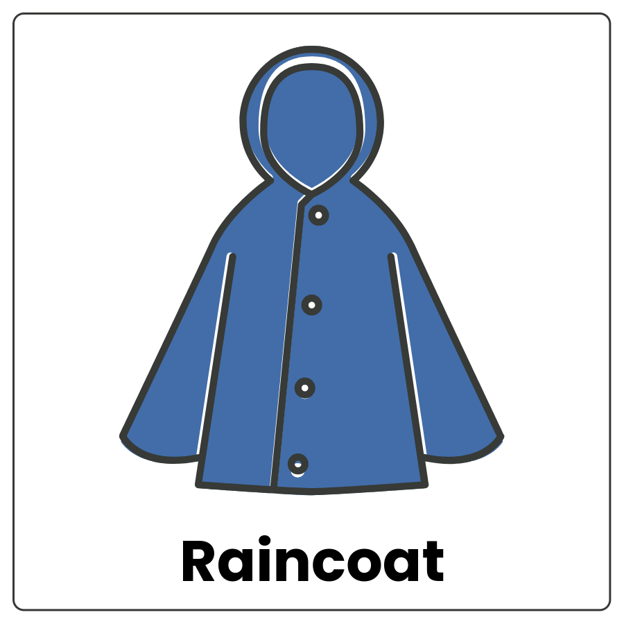Raincoat Download Image + Add to My Visual Cues Brief Description A coat to wear in the rain How to Talk About This Term with Young Children “We wear a raincoat in the rain to keep our bodies dry.” < Back to Visual Cues