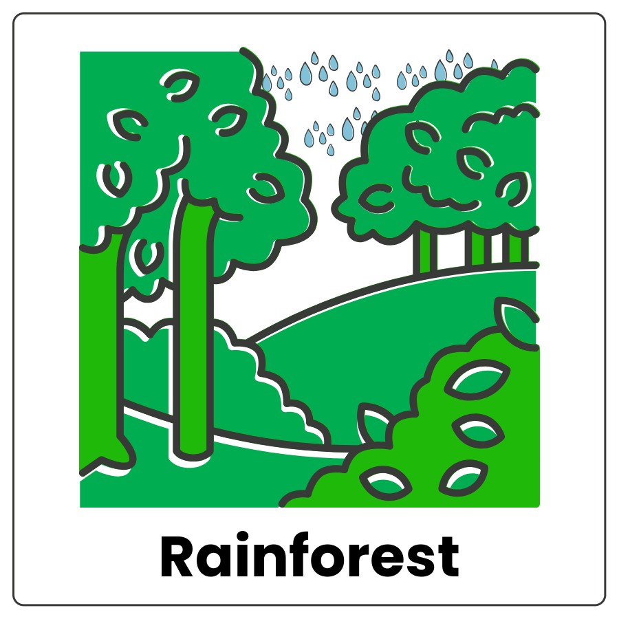 A particular type of forest that gets lots of rain all year round and have a particular type of evergreen tree that creates a large canopy at the top.