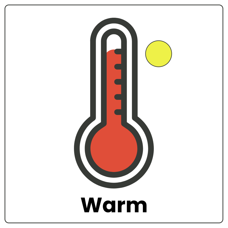 Warm Download Image + Add to My Visual Cues Brief Description A little bit hot How to Talk About This Term with Young Children “When it’s warm, the air might feel a little bit hot, but not very hot.” < Back to Visual Cues